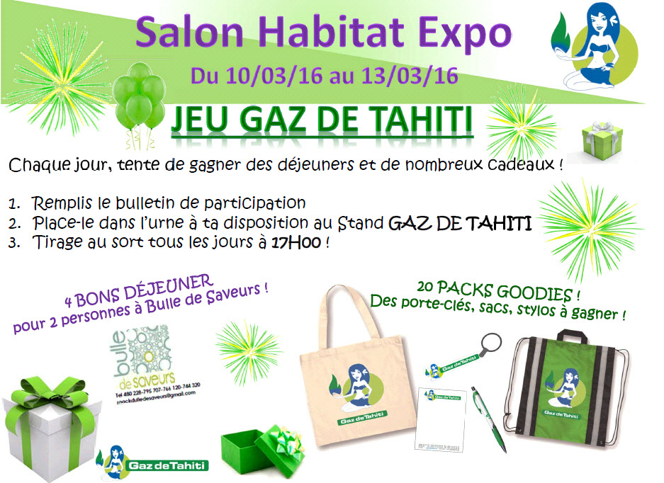 Actualités  Notre équipe se tiendra à votre disposition pour vous présenter les différentes offres de GAZ DE TAHITI : A cette occasion, GAZ DE TAHITI organise un jeu pour vous permettre de gagner de nombreux cadeaux !